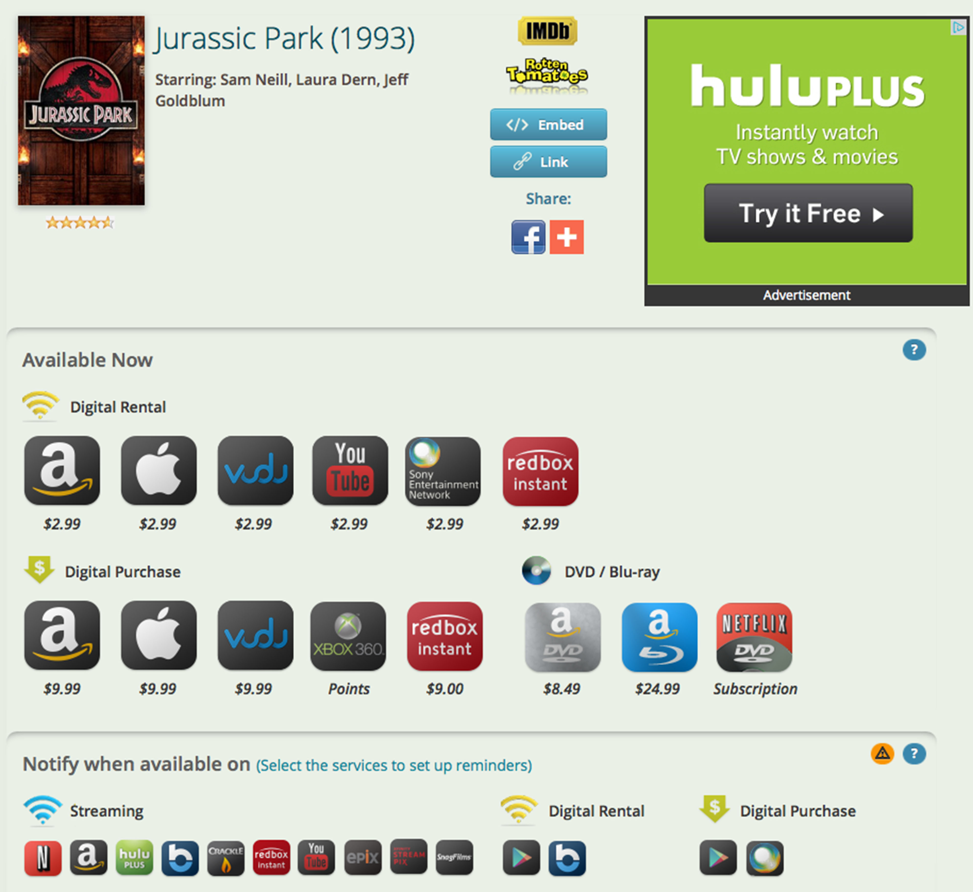 Given the sheer number of providers and amount of content available, an excellent tool to help users navigate this very confusing, and at times frustrating, marketplace is Can I Stream.it? (see figure 4.1). Can I Stream.it? allows users to search for popular film and TV content and aggregates a list of digital providers with the available title in several categories: streaming (e.g., Netflix, Crackle), digital rental (e.g., Amazon, iTunes), digital purchase (e.g., Amazon, iTunes), disc rental or purchase (e.g., Netflix, Amazon, Redbox), and cable access (e.g., Xfinity, HBO). CISI is also available as a mobile or tablet app or browser plug-in.