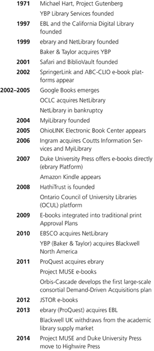 E-books represent a tsunami in the broad academic library ecosystem. Significant new organizations, platforms, and mergers and acquisitions (many under duress) have appeared in the academic library e-book landscape in little more than a decade. Figure 4.1 shows a brief timeline that may be helpful to get a sense of the acceleration of the wave sweeping our world.