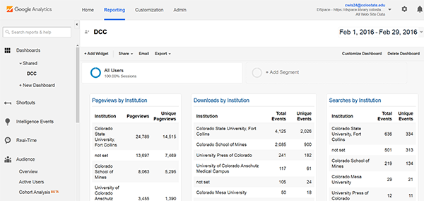 The Digital Collections of Colorado (DCC) is a consortium of seven academic institutions and one publisher in Colorado. The members include mainly public universities throughout the state with varying populations and missions: Colorado State University, Colorado State University-Pueblo, Colorado School of Mines, Colorado Mesa University, University of Colorado Anschutz Medical Campus, University of Colorado School of Law, University of Colorado Colorado Springs, and the University Press of Colorado. Colorado State University, referred to as CSU, hosts the repository and provides technical and administrative support to the other consortium members. In 2015, the DCC migrated to DSpace 5, which was configured to include a collection structure for each affiliated institution and its subsequent content collections (e.g., articles, books, reports, theses and dissertations, images, sound recordings, moving images, and datasets). Since the DCC is a consortium system, its usage reports must be available for the whole system and segmented into individual reports by the institution.