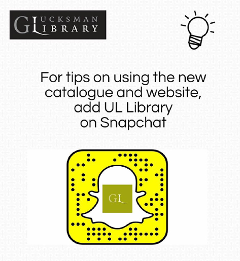 Example of a Facebook post promoting @libraryul’s Snapchat account using a snapcode (Source: University of Limerick Glucksman Library, [@ULlibrary], “We’re on Snapchat,” Facebook post, February 13, 2017, https://www.facebook.com/ULlibrary/photos/a.364124327122777/674343926100814/?type=3&theater.)