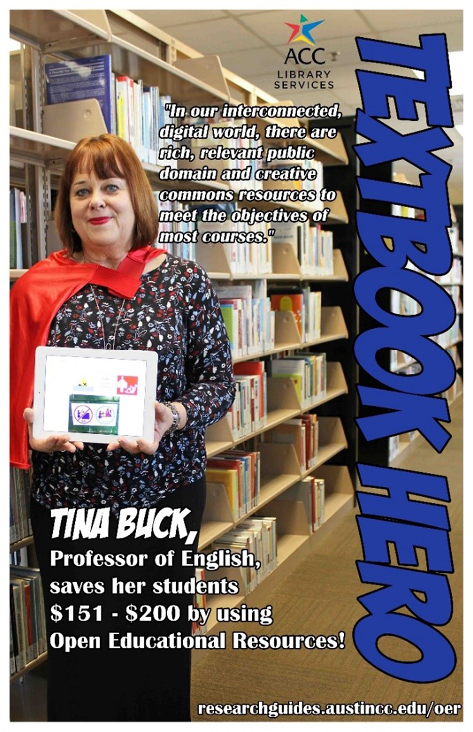 @acclibraries READ-style poster example (Source: Austin Community College Libraries, [@acclibraries], “Textbook Hero Tina Buck,” Instagram photo, March 7, 2018, https://www.instagram.com/p/BgB--57DUjs/.)