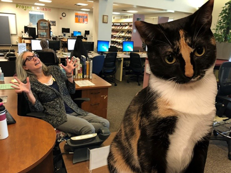 Tentpole days and events (occurrences such as National Cat Day, National Best Friends Day, etc.) are effective ways to connect trending topics to library content. @acclibraries, who adopts a lighthearted playful approach, recalled a recent successful post in which they photoshopped a giant cat next to one of their reference librarians for National Cat Day (see figure 1.3). @librariesluc reported that they do a big push for voter registration, using the motivating hashtag #LoyolaVotes. One tentpole event that never disappoints in the library realm, National Library Week, was commonly discussed among participants. Building off of 2016/2017’s ALA Presidential Initiative, “Libraries Transform: The Expert in the Library,” @acclibraries created a video series entitled “Expert in the Library,” promoting their librarians’ different backgrounds, skills, and professional areas of specialization.