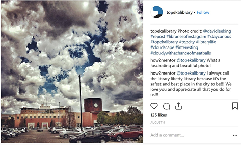 Library beauty shot example from @topekalibrary/@davidleeking (Source: Topeka & Shawnee County Public Library, “Photo of Topeka & Shawnee County Public Library Building by David Lee King,” Instagram photo, August 9, 2018, https://www.instagram.com/p/BmPUfUFFRDL/.)