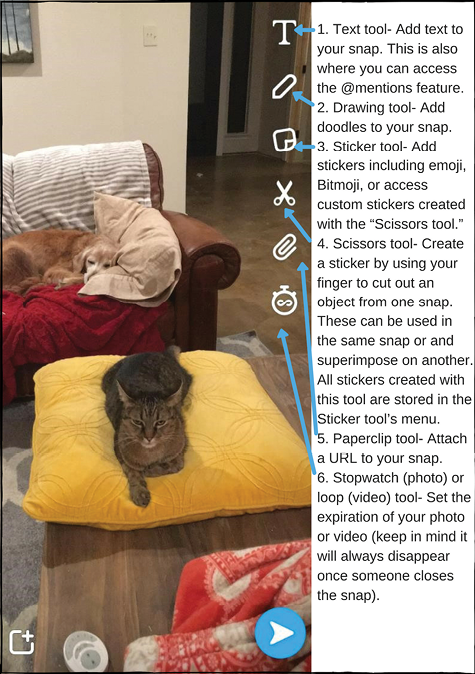 - Photo and Video Editing Tools—After you take a snap, there are several ways you can spice it up, add more information, and even attach a URL with Snapchat’s Creative Tools menu (which appears on the right side of your snap after it is captured). I am not going to discuss each tool in this chapter, but rather cover some ideas you can apply within a library context. If you are interested in going more in depth, Snapchat has a useful webpage devoted to the “how to” of each tool, and Hootsuite has a great “hacks” article.26 In figure 3.4, I have listed each tool’s label as a guide for the next section.