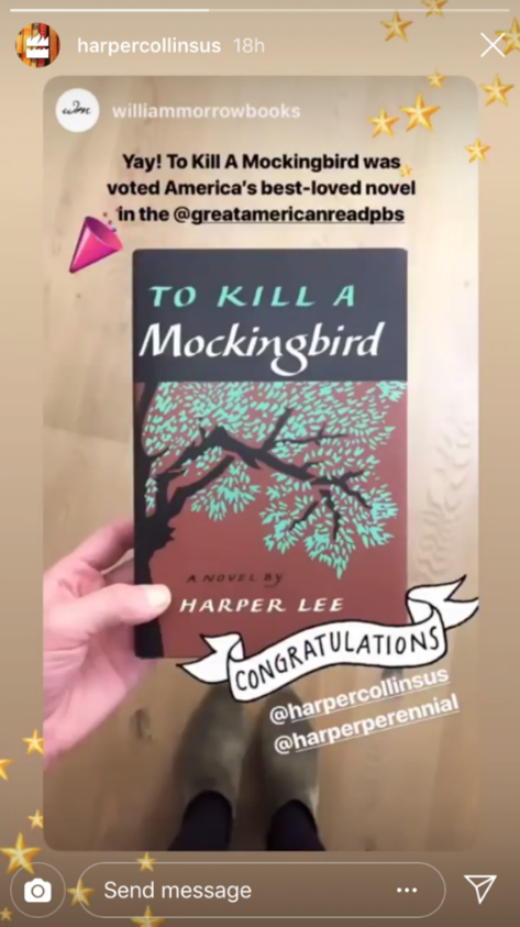 Example of an @tagged repost by @harpercollinsus. (This is also a nice example of IG sticker usage; see stickers in the section Stories Camera Effects and Features of this chapter.)