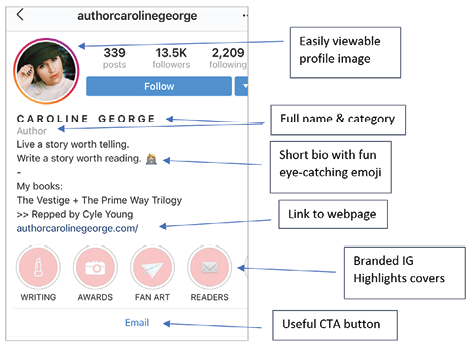 Example of an optimized IG bio, replete with branded Stories Highlights covers (Source: Caroline George, [@authorcarolinegeorge], Instagram page, accessed October 22, 2018, https://www.instagram.com/authorcarolinegeorge.)