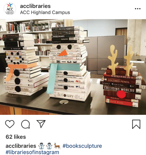 Winter book sculptures by @acclibraries (Source: Austin Community College Libraries, “#booksculpture,” December 20, 2017, https://www.instagram.com/p/Bc8k_v4gEO4/.)