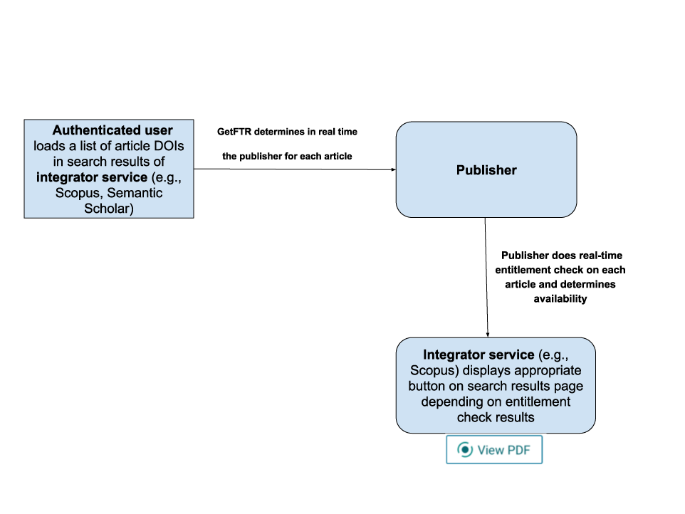 From the user’s point of view, imagine being on a platform like Scopus and, after doing a search, seeing ten article results displayed and not knowing which article you have access to. The platform needs to reliably tell users which of these articles they have access to. Of course, part of this process involves the platform, known in GetFTR jargon as the integrator service, needing to confirm and authenticate the user. GetFTR does not do anything novel here. Instead, it uses the existing authentication mechanics—either IP recognition or SAML-based methods, which include SeamlessAccess, as described earlier. What is novel is that once the platform authenticates the user, platforms that support GetFTR do real-time entitlement checks with GetFTR-supported publishers to get accurate and up-to-date information on whether the user can access the content and to display the information accordingly.
