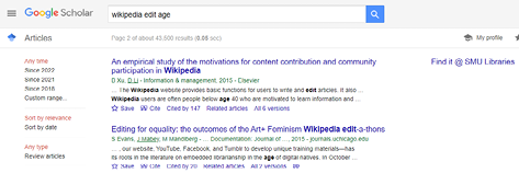 The closest traditional link resolvers come to supporting this feature is via the implementation of the Google Scholar Library Links program. When a user clicks on a displayed link in Google Scholar, they experience the same thing as they do on other platforms supporting library link resolvers. However, instead of displaying the same link next to every result, Google Scholar displays a link only for results where the user has access. See figure 4.7 for an example where one result has a link displayed (Find it @ SMU Libraries) and the other does not because Google Scholar knows the user is not entitled to access to the second resource via their institution. It can do so because Google Scholar obtains a local copy (which is updated periodically) of the institution’s holdings or entitlements in advance and uses that to determine when to show a link.