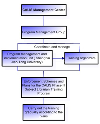 To guarantee the standardization and effectiveness of the subject librarian training, the program management group appoints organizers for the training according to the training requirements. After submitting the "Enforcement Schemes and Plans for the CALIS Phase III Subject Librarian Training Program" which are examined and approved by the program management group and authorized by the CALIS management center, the organizers implement the training (see fig. 1).The project management group communicates and coordinates with the organizers, and offers them guidance and standards for carrying out the training according to the requirements of the CALIS management center and program management schemes of the subject librarian training program.