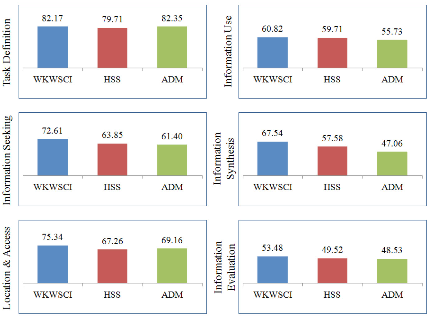 Figure 6 presents the comparisons of mean scores for each IL skill across the three schools. It was found that the scores for “information synthesis” showed the greatest difference, with WKWSCI having the highest score percentage of 67.54 and ADM having the lowest score percentage of 47.06. This is probably due to the higher requirement in synthesizing information for students majoring in communication studies, especially for those specializing in journalism and communication research.