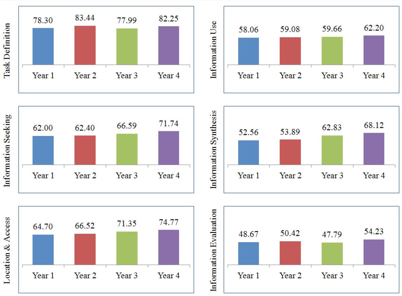 The study found that students scored higher in areas related to “task definition,” “information seeking strategy,” and “location and access.” These are skills that can be taught more systematically, for example in LIS instructional programs offered by libraries, or acquired over time through practice in completing their academic assignments and project work. The scores attained for areas of “information use,” “information synthesis,” and “information evaluation” were found to be relatively unsatisfactory. These may be attributed to higher order thinking skills needed to differentiate the quality and relevance of the retrieved information, and to subsequently synthesize, extract, and connect bits of information for use to complete their tasks. This may suggest that more elaborate efforts and the right forms of pedagogy, possibly including mentoring, need to be in place to transmit such skills to students over time.