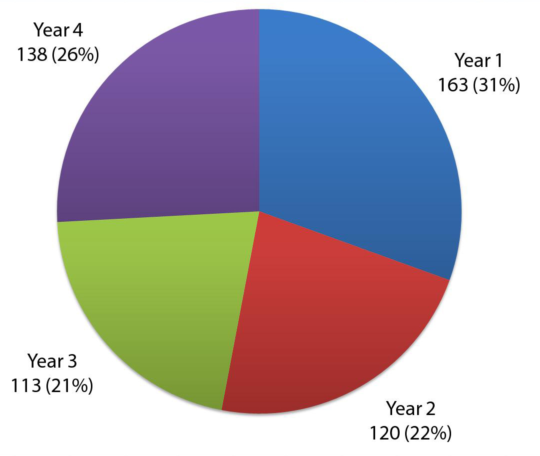 Among the 534 responding students, the majority (525 or 98.31 percent) were born between 1986 and 1992, and 126 (23.6 percent) were male while 408 (76.4 percent) were female. Some 489 (91.6 percent) of the respondents received their pretertiary education in Singapore. The majority of students (531 or 99.4 percent) own a personal computer, and nearly all of them (except 1 student) have Internet access at their place of residence. Only 90 (16.9 percent) of the students had taken the course related to IL. The respondents’ year of study was shown in figure 1.