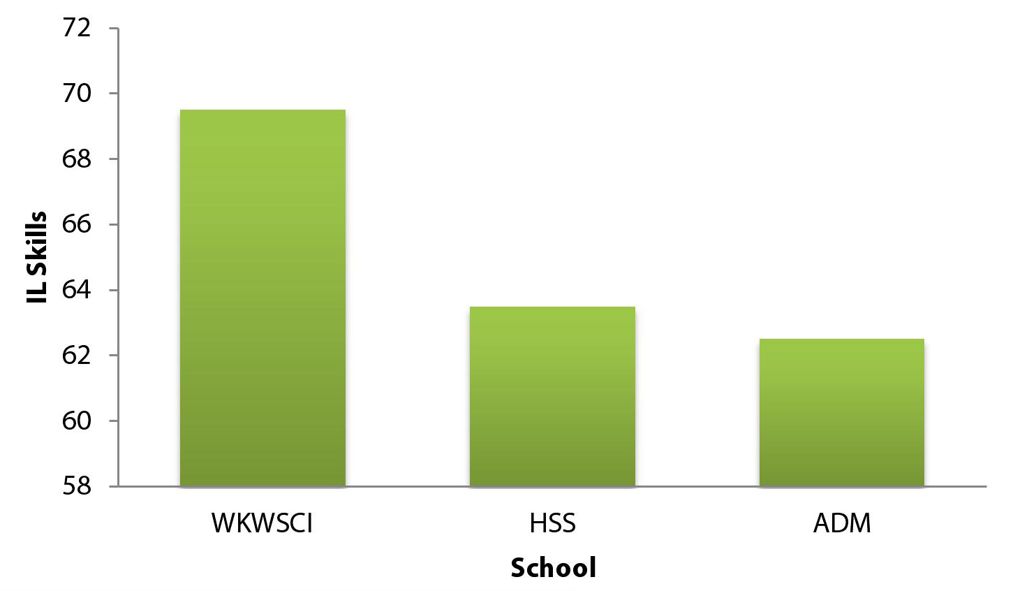 Figure 5 shows the standardized mean percentage score across the three participating schools. It was found that students from WKWSCI scored higher than the other two schools. This result was expected as IL had been integrated as a compulsory course into their curriculum for these students. It is also possible that these are brighter students as the academic requirement for students admitted to WKWSCI are the highest among the schools in the college.