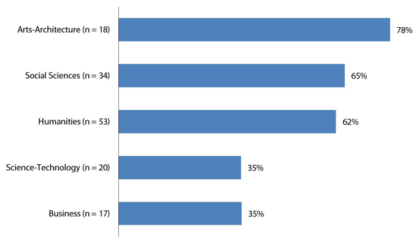 The data supported our third hypothesis that the subject discipline of the course would affect the amount of library research required, with art/architecture and the social sciences requiring the most library use and business and the sciences and technologies requiring the least amount of library use. This hypothesis was tested in two ways. The first method compared each of five broad disciplines to each other; the second method compared science-technology syllabi to the rest of the syllabi (two groups). Figure 4 shows the percentage of syllabi requiring some library use/research across broad subject area. Chi-squared analysis yielded a p-value of 0.03, supporting our hypothesis that the amount of library use required does differ significantly across disciplines.