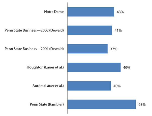 Happily, the data did not support our first hypothesis that a majority of the classes would not require library use. While 43 percent of the classes did not require use of the library at all, 57 percent of the courses did require library use, at least to some degree. Also, even though our rating systems varied to some degree, our figures compare favorably to the results of similar syllabus studies described earlier in this article. Figure 2 shows the comparison of syllabi requiring no library use at Notre Dame with the syllabi at other universities. Nonetheless, even though the majority of syllabi indicated some library use, if only minimal, there are clearly many classes that do not require any degree of library use, providing the library with many opportunities to reach out to faculty to embed the library and its resources into their curriculum.