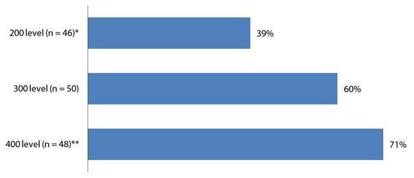 The data did support our second hypothesis which was that the level of the class (freshman-100, sophomore-200, etc.) would affect the amount and degree of library research required, with the more advanced classes requiring more library research. As shown in figure 3, the percentage of course syllabi requiring library use increases as the class level increases. Chi-squared analysis yields a p-value of 0.03, indicating that there is a statistically significant relationship between required library use and class level for our sample.25