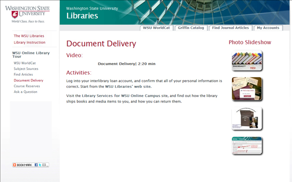 Nearly all academic libraries offer online tutorials to assist users in understanding library resources and services. Construction and maintenance of these tutorials is a time-consuming and complex enterprise. Minor revisions to the tutorials are made throughout the academic year as frequent changes to library services, databases, and procedures require. Over the last several years, however, instruction librarians at Washington State University (WSU) reserved summers for the major revision of online tutorials and other online instructional tools. One of the most used set of tutorials, the “online tours,” had been revised many times by rewriting text and updating screenshots or graphics. The set of tours was designed for two audiences—for students of the native Pullman, Washington, campus and for distance students enrolled in the “WSU Online” campus. Links to the tours have been available through the libraries’ website, LibGuides, and have seen extensive use as an embedded component of UCOLL 300, the libraries’ credit-bearing information literacy course.