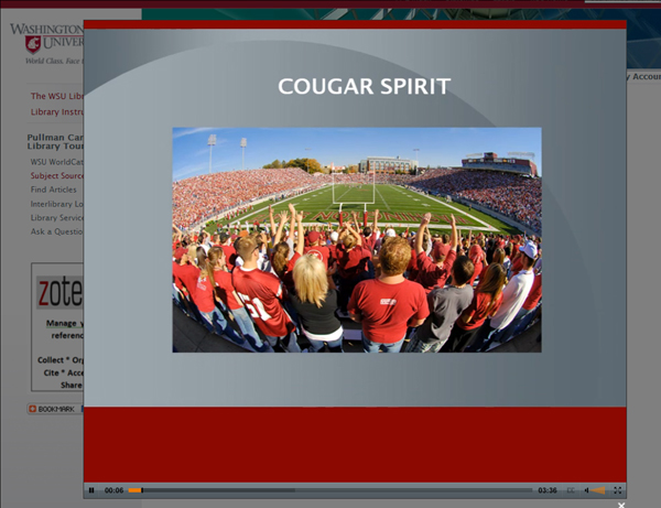 Several articles have been written discussing practical issues, such as the types and quality of software used in production, while outlining concrete steps to take in designing instructional videos. Beales, as well as Meehan and Hyland, compared screencast software and reviewed some of the more practical elements of video production.3 Koury et al. also outlined some helpful multimedia tutorial design tips based on their experiences at Idaho State University, and Farrell, Driver, and Weathers discussed their experiences in pairing multimedia tutorials with the course management software Blackboard.4 Fortunately, librarians at WSU had experience from which to draw. For several years, Library Instruction had produced various tutorials with Qarbon Viewlet software, which facilitates the production of Flash-based presentations and interactive modules.5 Most recently, WSU librarians have used Camtasia as the primary tool for producing instructional videos.6 Other software used to remake the online tour and its contents includes Microsoft PowerPoint, Adobe’s Spry UI Image Slide Show, and JWPlayer.