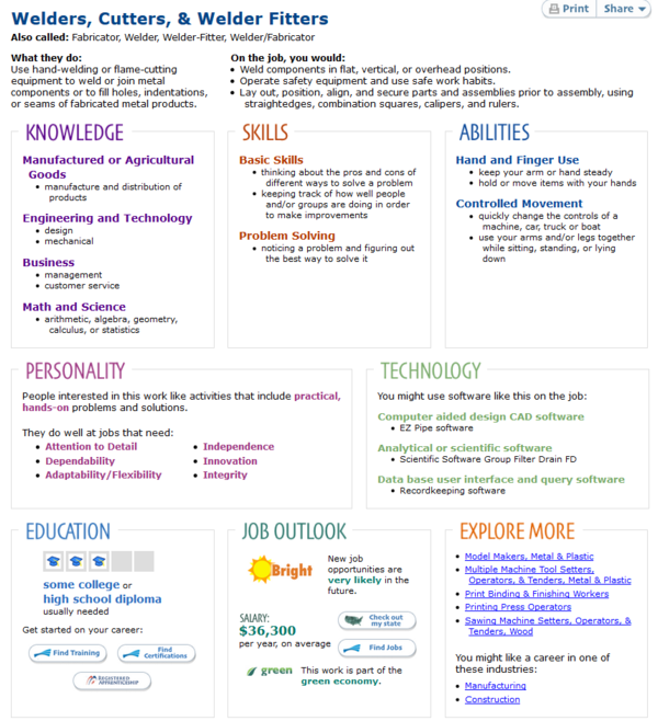 The records retrieved through the various searches contain extensive information about each job in three formats: summary, details, and custom. The summary record includes sections such as tasks, technology, and tools used, as well as the important knowledge, skills, and abilities (KSAs) needed for that particular career. The “Job Zone” describes educational, licensing, and experience requirements. It also shows percentages of survey respondents that attained particular education levels (e.g., the percentage of welders holding associate’s degrees). A detailed report ranks the KSAs in order of importance and provides more detail about each one. A custom report that selects only important fields such as importance rating and work activity can be downloaded to a spreadsheet or other database. The information can then be used to compare jobs across any number of factors for analysis like that done by Klusek and Bornstein.7