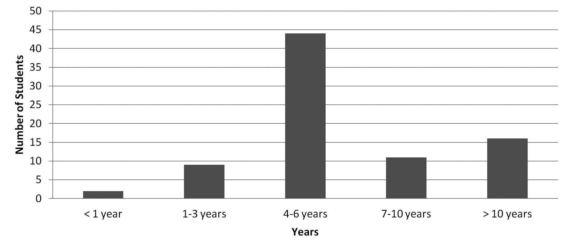 Over half of the respondents reported being thirty-years old or older (figure 1). The majority of respondents were in the 30–39 age group (30 students) closely followed by those 40 and older (28 students). When location was taken into consideration, it appears that there is representation from all age groups in both the traditional and nontraditional programs, with the nontraditional Scranton Saturday program (located on the main campus) having the highest enrollment of all locations (31 students). Additionally, a majority of students surveyed reported earning their undergraduate degree within the past 4–6 years (44 students), with 16 students reporting having earned their first degree in the past 10 years or more. Only two students reported having earned the degree less than one year ago (figure 2).