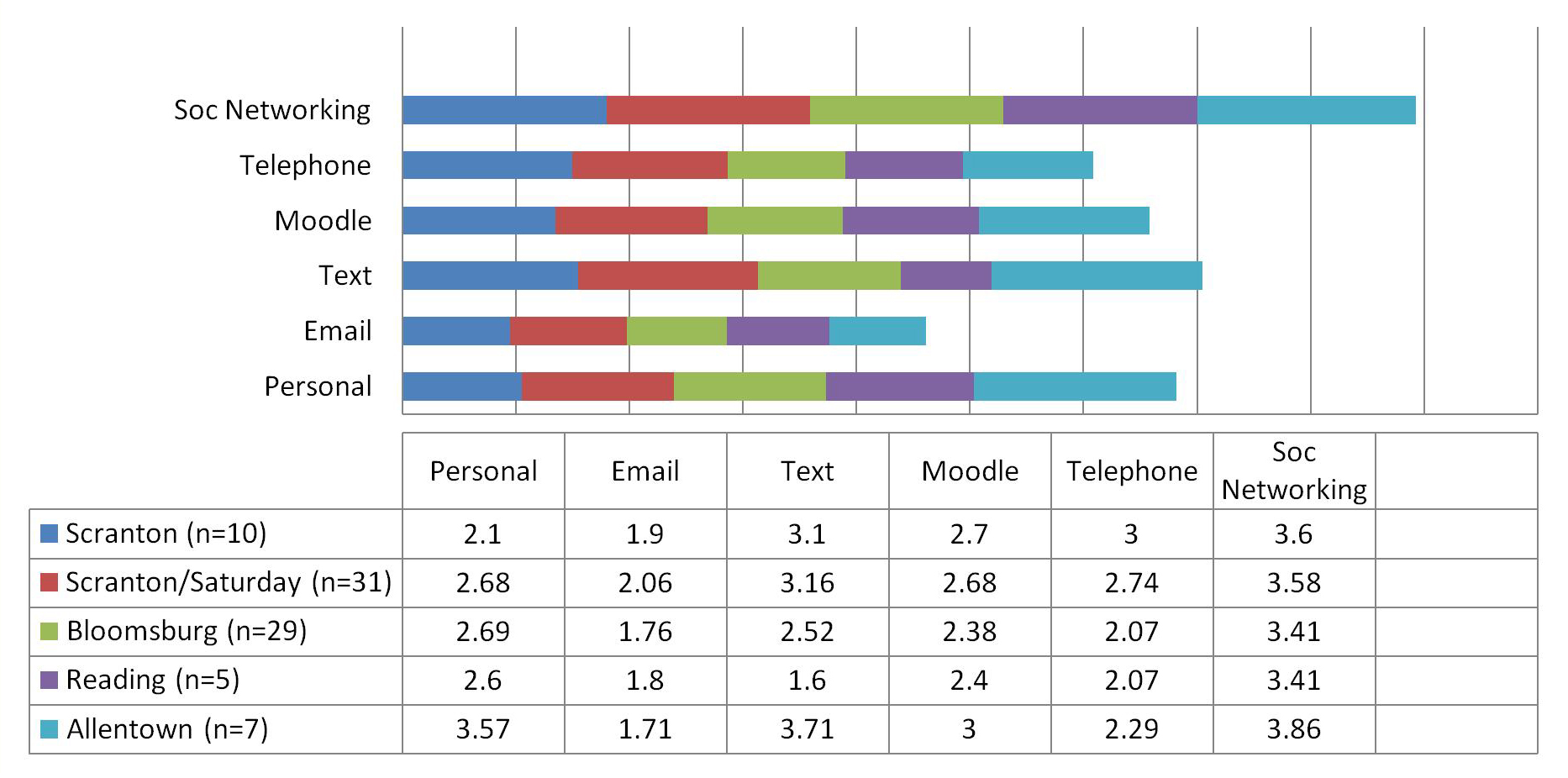 A majority of satellite program respondents, despite the distance from the main campus, indicated a positive inclination for face-to-face help. The only exception is with respondents from the Allentown campus who were more neutral in this regard (figure 8). Unsurprisingly, respondents from the traditional on-campus program in Scranton reported the strongest preference for in-person assistance, although this variation is slight. Respondents across all locations (with the exception of Allentown) also showed a positive inclination for seeking help through their Moodle course page if available, whether a librarian is embedded in it or not. Seeking help via email however is the first choice for all respondents.