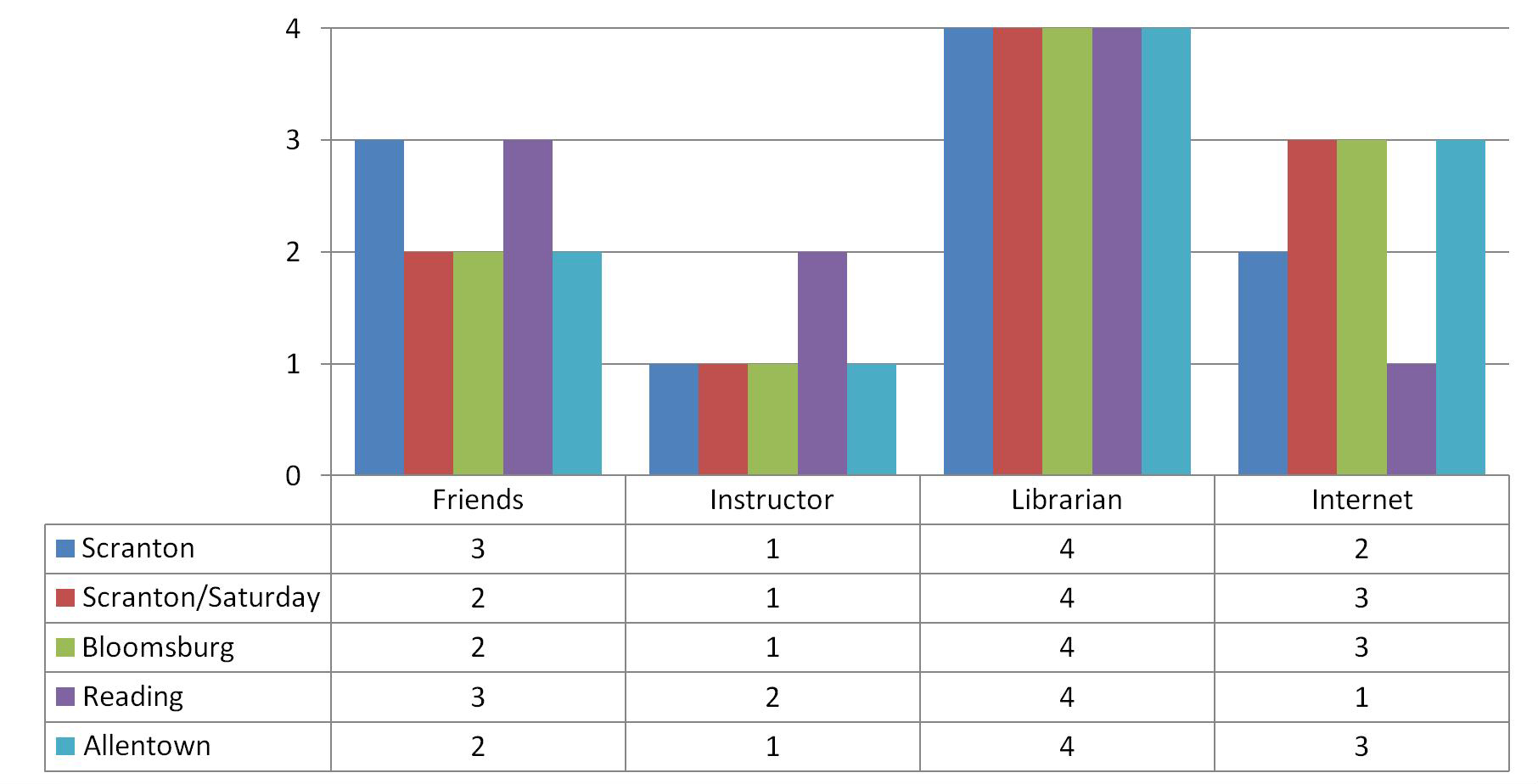 Respondents across all campus programs indicated that they would seek help from a librarian last (figure 12). Also respondents across all campus programs indicated seeking help from their instructor as their first choice.
