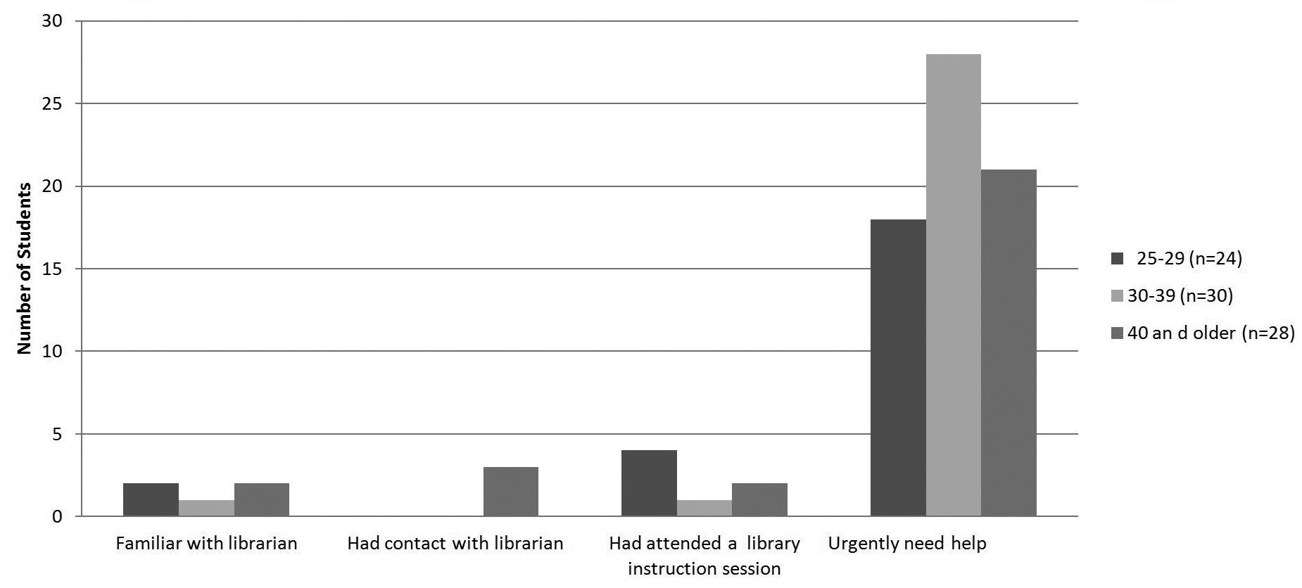 There is a marked difference between the younger adult learners in the 25–29 age group and their older counterparts regarding how often they seek help. A majority of the adult learners in the younger age group reported not seeking help from a librarian at all during the semester (figure 6). Only nine (out of a total of 24 students) indicated that they sought help “1–5 times.” Conversely, a majority of the adult learners in the older age groups reported that they sought help from a librarian “1–5 times” during the semester.