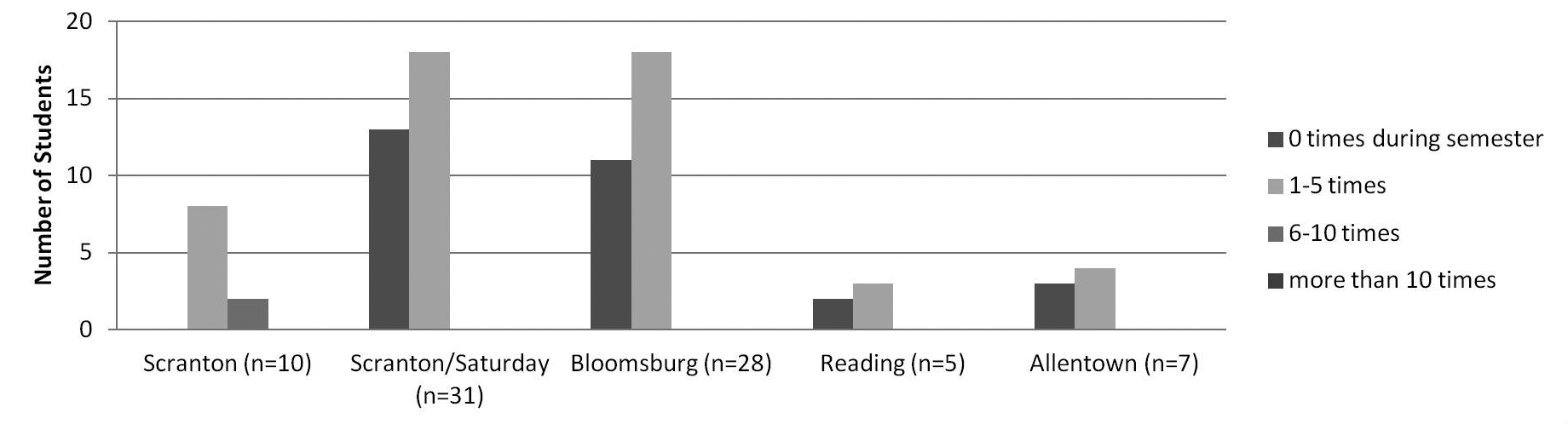Only respondents from the traditional Scranton program indicated seeking help from a librarian more than six times (figure 11). A majority of respondents from across all campus locations reported having sought librarian help between one and five times during the semester. However, a relatively high number of respondents from the satellite locations also reported not seeking help at all.
