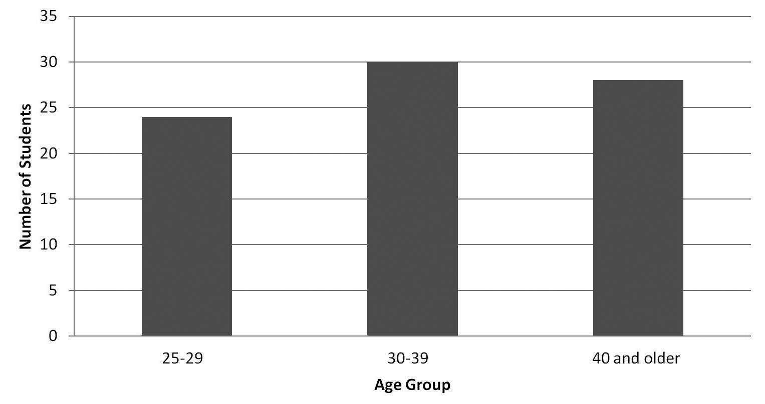 The survey obtained a total response rate of almost 37 percent with 119 out of the 323 students completing the survey. From the demographic data collected, almost 69 percent of the respondents or 82 were considered “adult learners” or were at least twenty-five years old. Respondents reporting to be in the 23–29 age group were filtered by number of years since they earned their undergraduate degree, thus counting only those respondents who would be at least twenty-five years old. Henceforth, this age group is referred to as 25–29 year olds. (In retrospect, a better gauge would have been to create a 25–29 age range when designing the survey instrument as the act of filtering mentioned above could possibly have excluded some adult learners from the study.)