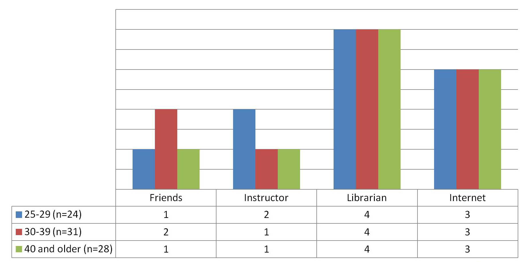 From the findings, age does appear to have a slight impact on where these adult learners go first for research help. Adult learners in the 25–29 age group prefer to seek help from friends/classmates first and from their instructors second (figure 7). (This represents average rankings). Conversely, adult learners in the 30–39 age group prefer to seek help from their instructors first, followed by their friends/classmates. Those in the 40-and-older age group preferred to seek research help equally from their friends/classmates and from their instructors first. A troubling finding which confirms both anecdotal and earlier studies is that a majority of adult learners across all age groups prefer to seek help from a librarian last. They also prefer to go to the Internet for help instead of going to a librarian, even for their second and third choices.