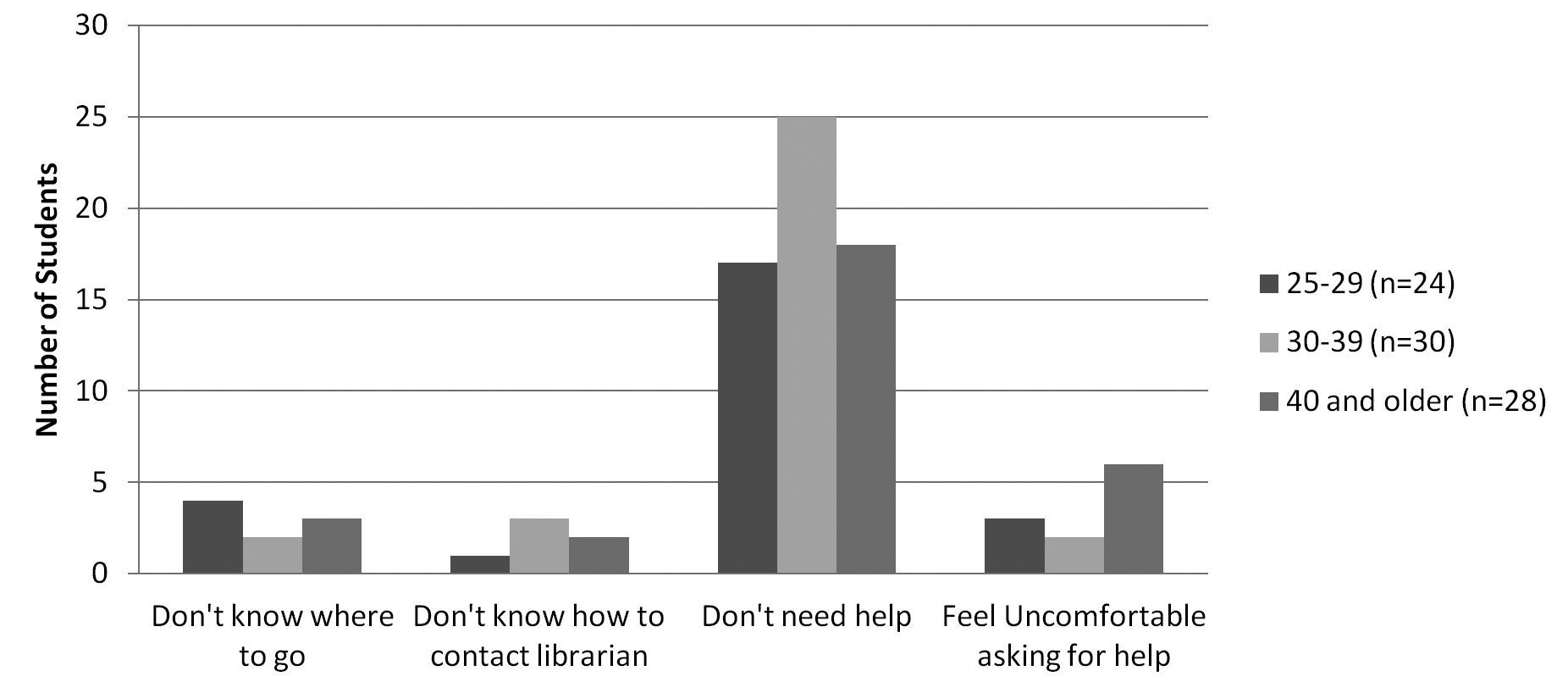 But what are some of the factors that would deter these adult learners from seeking help from a librarian? Since a majority prefer to seek help from their instructors first, it is possible that these adult learners, as Gibbs determined in her study, regarded librarians as lacking the ‘subject expertise” they needed. Additionally, a large number of adult learners particularly the 25–29 years-olds, also preferred seeking help from their classmates/friends. This finding is especially telling, because it points to a level of familiarity and comfort with the person they are seeking help from. Obviously, the librarian does not fall into this category. A few of the adult learners across all age groups and program locations did indicate that they felt “uncomfortable” seeking help from a librarian. But these numbers are very small.