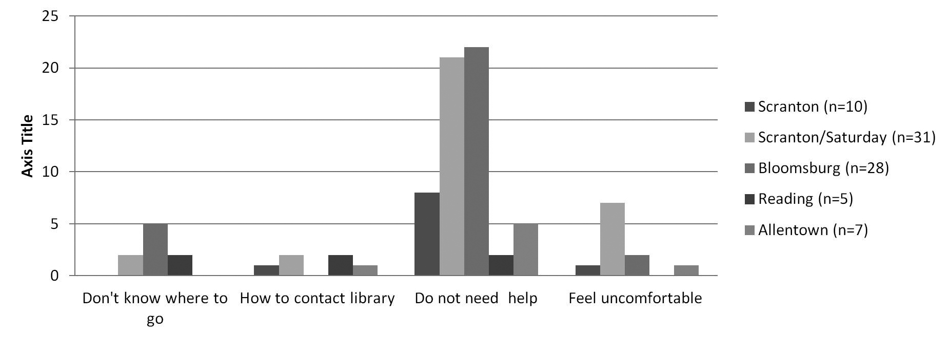 Several respondents from the satellite programs reported not knowing where to go to seek librarian help (figure 9). A welcome finding is that all respondents from the traditional on-campus Scranton program knew where to go to seek help. A few respondents across all locations (except Bloomsburg) indicated that they did not know how to contact a librarian with almost the same number indicating that they feel uncomfortable approaching a librarian for help. A majority of these students were from the Scranton/Saturday program, which coincidentally also had the highest number of students who were in the 40-and-older age group (as findings above show). With the exception of Reading (where there were equal numbers for not knowing where to go, how to contact the library and feeling uncomfortable), an overwhelming majority of respondents from all locations indicated that they did not need any help.