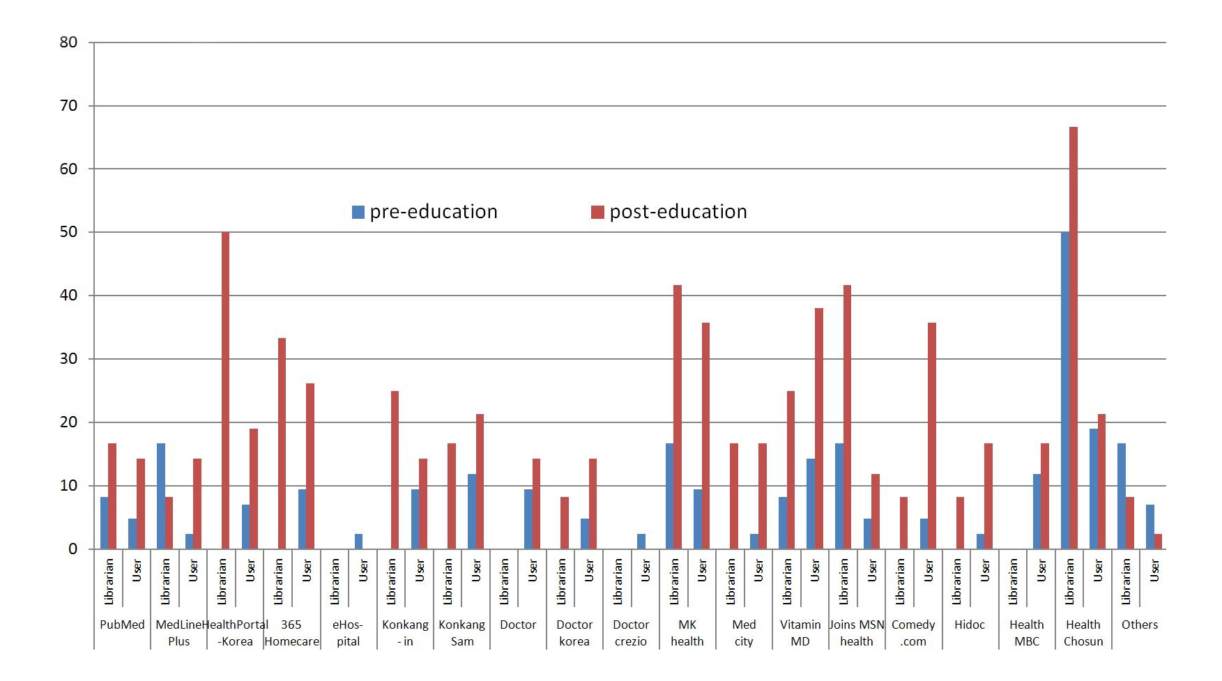 Sixteen public librarians participated in the librarian education portion of this research along with 40 college students taking a course about reference information resources. Among these, 12 librarians took the preeducation survey and 14 did the post-education survey. To measure the effects of the program, the study excluded the two librarians who did not respond to the preeducation survey from. The researchers did not survey the college students either, since the training was designed only for currently active librarians and it was felt that their results would not accurately reflect the realities of the workplace. The students were allowed to participate only for their own educational purposes. Of the surveyed librarians, the gender proportion was 16.7% males and 83.3% females. The age distribution across the group is as follows: 20 to 29 years, 16.7%; 30 to 39 years, 33.3%; 40 to 49 years, 25%; 50 to 59 years, 16.7%; nonrespondents, 8.3%. The distribution of degree level in library and information science was: doctorate degree, 8.3%; master’s degree, 25%; bachelor’s degree, 50%; non-respondents, 8.3%. Their positions in the library were defined as the two positions in which they have spent the longest time, both reference service and management/planning were the highest percentage with 41.7%.The other categories represented were: acquisition at 33.3%, user education at 25%, and classification and cataloging at 16.7%.The user education program had 63 total participants. The length of the program was 3 weeks, and the subjects of analysis were the 42 users who participated for the entire program without absence (66.67% percent of the total). The gender proportion was 26.2% males to 71.1% females (1 nonrespondent). The age group distribution was as follows: 20 to 29 years, 28.6%; 30 to 39 years, 21.4%; 50 to 59 years, 4.8%; 60 to 69 years, 11.9%; 70 to 79 years, 14.3%. To identify their individual Internet usage behavior, the survey asked how many hours they spent on the Internet per day, and those who answered 1 to 2 hours had the highest proportion (40.5%) followed by less than 1 hour (28.6%). On the education post-survey, the proportion who answered 2 to 3 hours increased slightly. User participants were also asked how frequently they use the Internet to search for health information, and those who answered “1 or 2 times” had the highest proportion and “never” had the second highest. However, after the education, the proportion of “never” had decreased from 45.2% to 28.6%. The education significantly increased the proportion of users who use the Internet to search for health information (p = 0.0377).