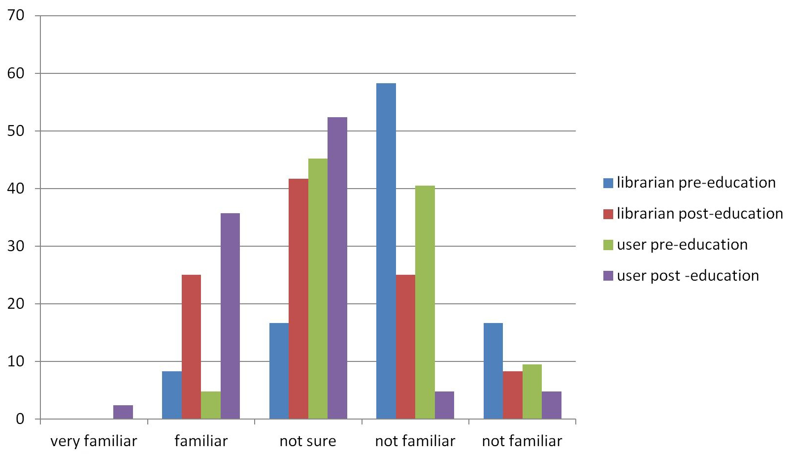 The researchers compared familiarity with CHI terminologies before and after the program in both the user group and the librarian group. In the librarian group, the proportion of librarians who were familiar with CHI terminologies increased, and the proportion of those who were not familiar decreased considerably. Specifically, the librarians who answered that they were “familiar” with CHI terminologies increased from 8.3% to 25%, and those who answered “not familiar” decreased from 75% to 33.3%. However, the difference was not statistically significant, most likely due to the small sample size. None of the participants answered that they were “very familiar,” probably because of the short program period which may not be sufficient to give them confidence.