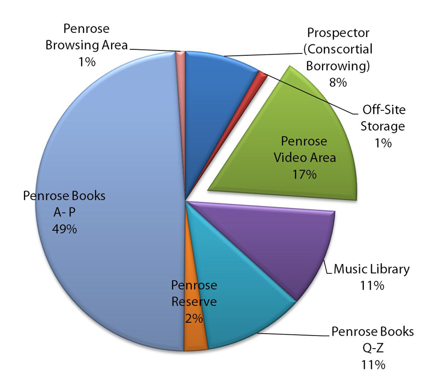 The librarians also looked at circulation statistics. Penrose had never limited media circulation by university affiliation. All of the university community including undergraduate students and community borrowers could check out videos; however, in general, patrons were not checking out videos. Even circulation for the new popular films remained flat. It is possible that the students, faculty, and staff were not even aware that Penrose had a video collection that circulated. They were not browsable because the stacks were closed and completely out of sight, as patrons had to rely on using the online catalog and research guides for discovery. Students either did not know Penrose had the films, or the closed stacks were a barrier for access.