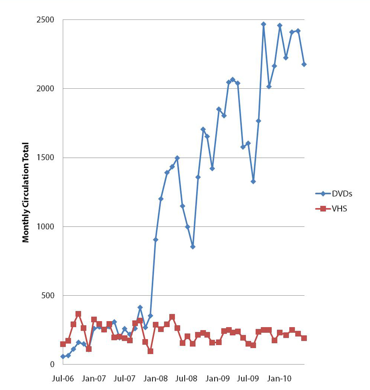 In 2007 Penrose Library maintained and circulated a modest video collection of 6,948 titles (1,486 DVDs and 5,498 VHS cassettes). These were housed in accession order behind the circulation desk and were retrieved upon patron request, requiring staff mediation. The rate of circulation of both DVDs and VHS cassettes remained flat for several years at an average of fewer than 500 titles circulating each month.