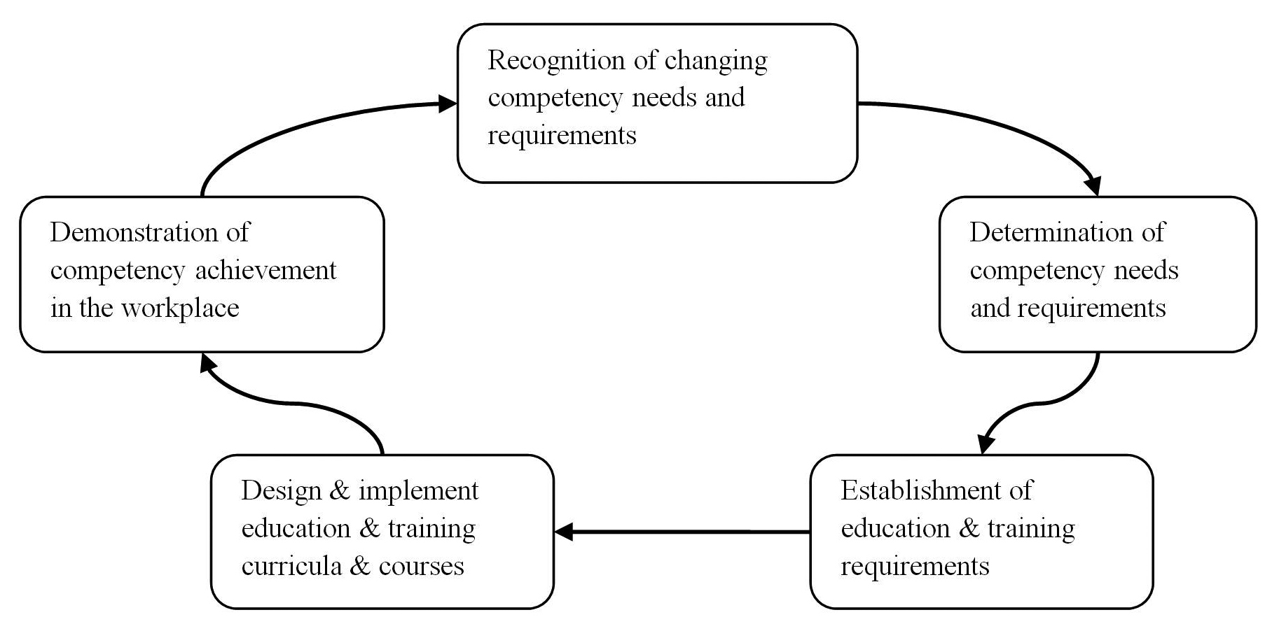 As a practical profession where behavioral objectives are important, librarianship enhances itself by achieving a variety of competencies in the increasingly diverse working environment. This study continues the competency determination efforts in the reference literature by generating a prioritized list of essential competencies for the most recent reference progression: text reference service. As indicated by Griffiths and King’s model competency achievement process in figure 1, once the competency needs and requirements are determined, corresponding training and education follow in order to accomplish the identified competencies.32