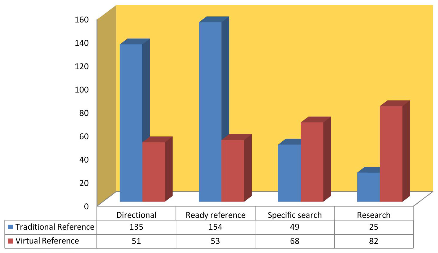 There could be various reasons for the tangible difference in the number of research questions raised in traditional and virtual reference. Future research could focus on the differences and quality of answers provided in virtual and traditional reference services.