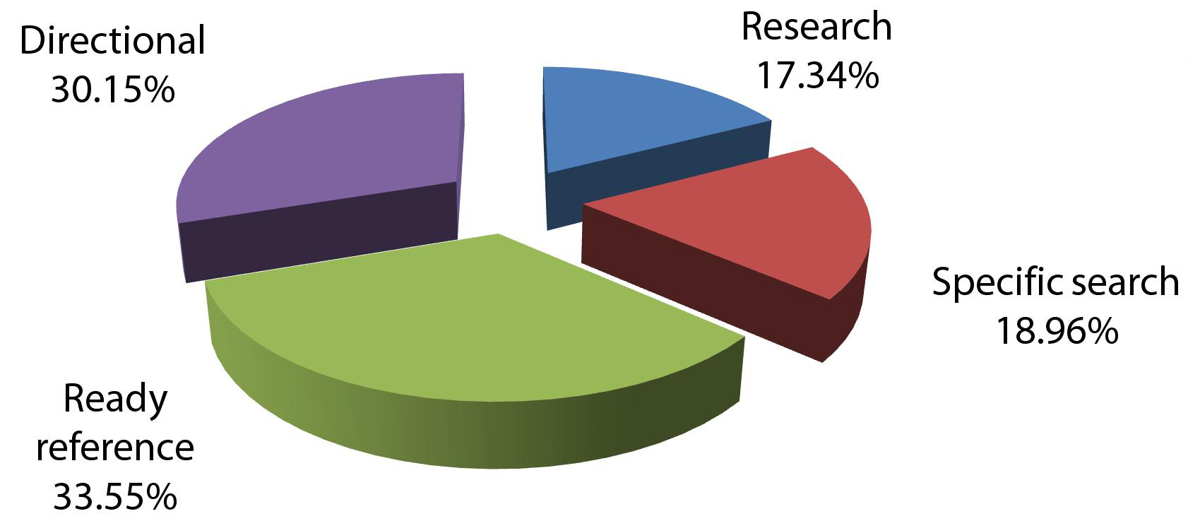 The most frequently asked reference questions by type were ready reference questions with 33.55 percent while the least frequently asked queries were research questions with 17.34 percent (see figure 1).