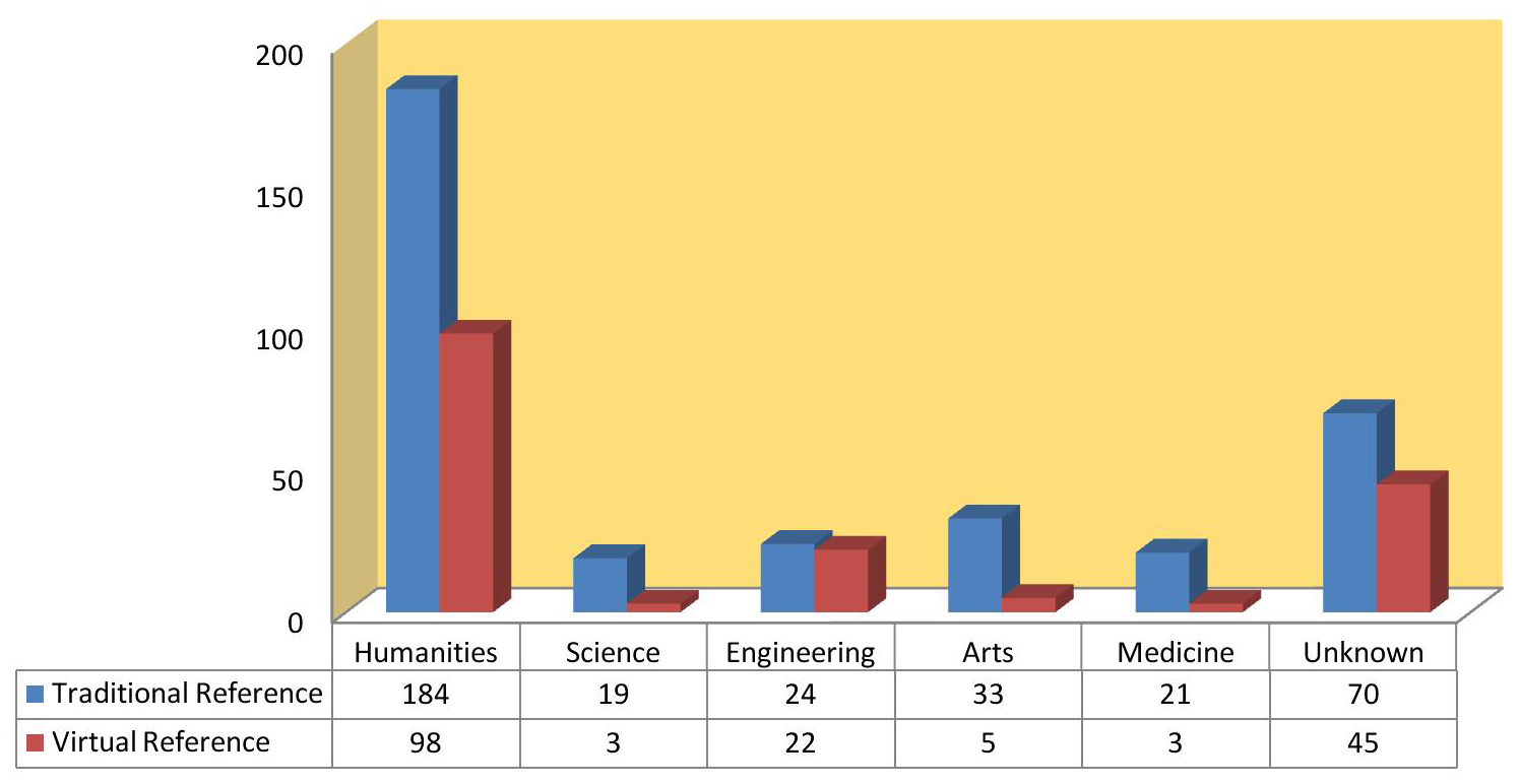 The findings indicated that the most questions clustered in computer science, information, and general works (000) but that users studying humanities asked more reference questions. An investigation was done that showed that from the humanities group, the field of Library and Information Science (13.96 percent) was on the first rank. This seems to indicate that librarians used these kinds of reference services more than users of other fields because they are more familiar with these information services in libraries. Again, it seems that the NLAI should seriously market these services so that users of other fields of sciences especially researchers make effective use of virtual reference service.