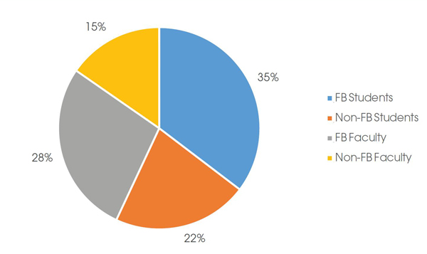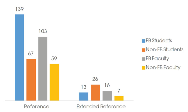 Data analysis demonstrates that a correlation between reference interactions and personal friending on Facebook does exist. Although only a minority of the Conservatory of Music population were Facebook friends with the performing arts librarian, this group accounted for the majority of reference interactions. The chi square test was used to determine that these results were significant, χ2 (1, N = 430) = 103.64, p < .001. Statistics for student friends were quite consistent with the overall findings of this study with 62.04 percent of student interactions occurring from only 39.58 percent of the student population. This was also significant, χ2 (1, N = 245) = 51.63, p< .001. Interestingly, the disparity increases even more for faculty as 64.32 percent of faculty interaction occurred with only 27.78 percent of the faculty population, χ2 (1, N = 185) = 123, p < .001.