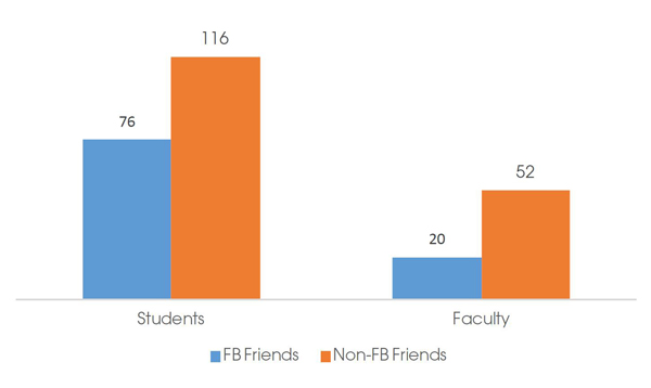 During the fall 2012 semester, there was a total of 264 students and faculty (192 undergraduate students and 72 tenure track and adjunct faculty) in the Conservatory of Music; 96 of these 264 patrons (36.36%) were friends with the performing arts librarian on Facebook (see figure 1).