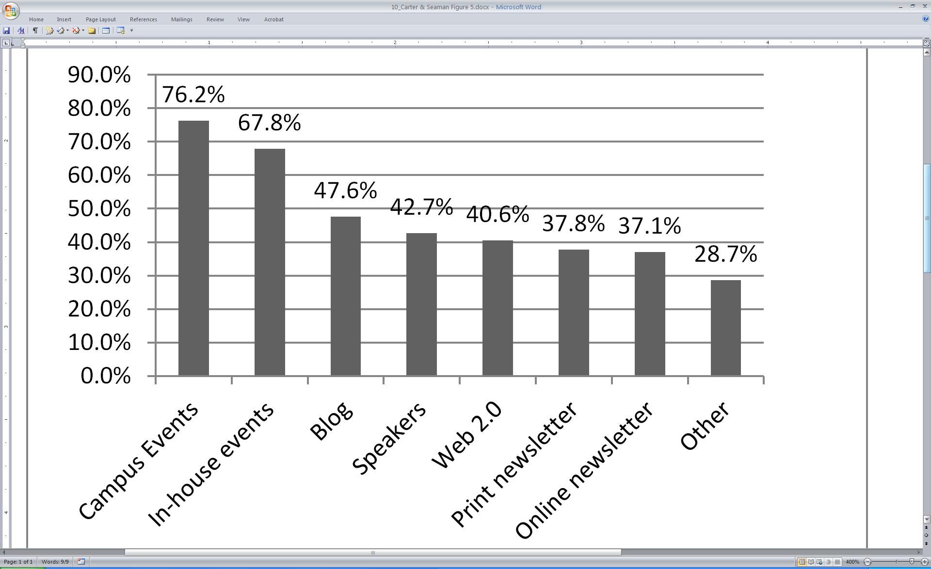 The avenues employed for the promotion of services through marketing and public relations often take the form of communications: websites, e-mails, newsletters, both print and online, blogs, and other Web 2.0 tools assist libraries in promoting their services. Branding and free giveaways also prove popular. Considered a service offered by libraries, orientations play a dual role by serving as a venue for libraries to market services, resources, and facilities to their users. Overwhelming, however, campus and library events, as well as displays and exhibits represent the most common types of outreach activities, and although the literature does not confirm this, possibly the most effective in promoting libraries.3