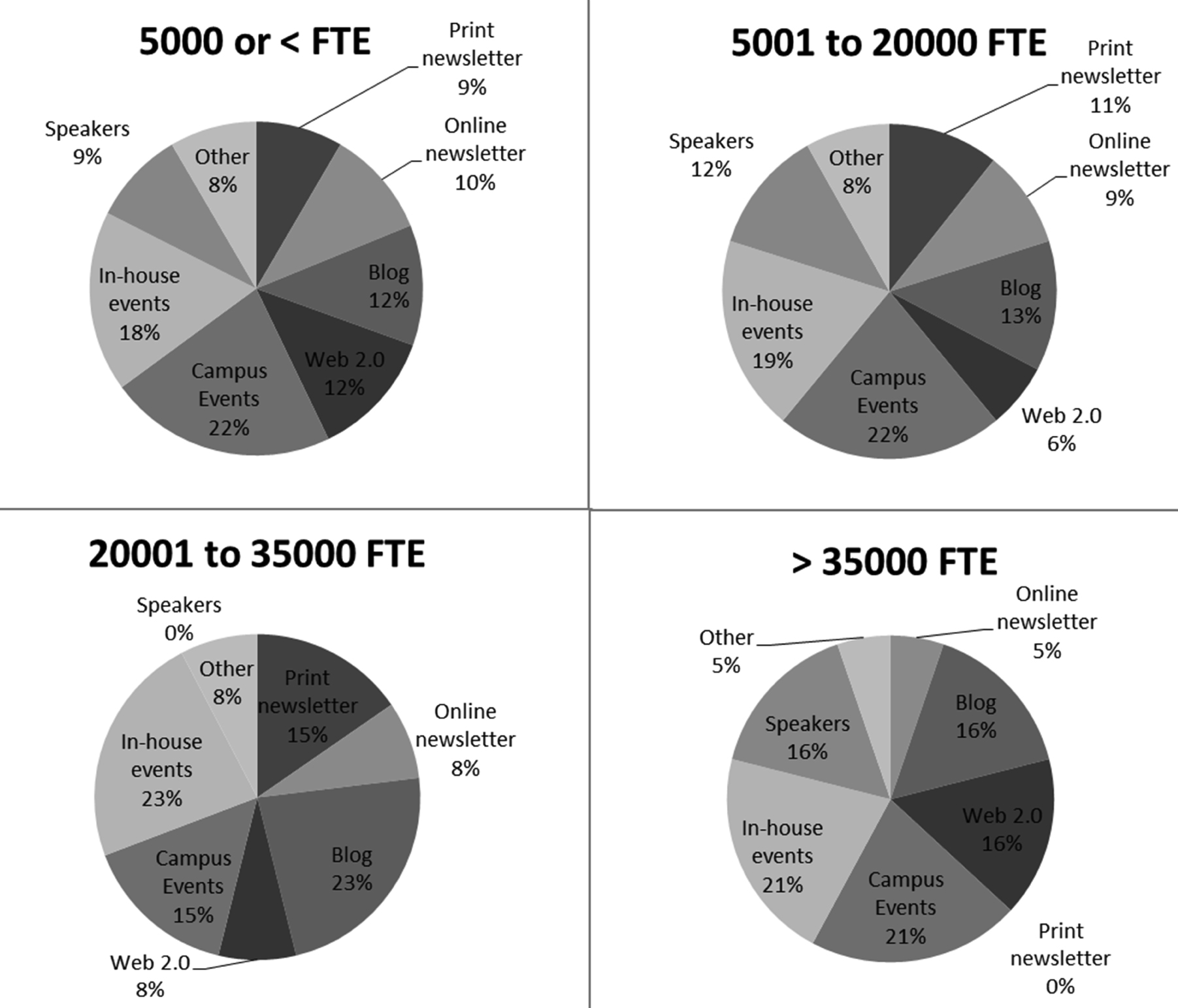 To gather information about the communication venues and library-sponsored events and exhibits used by libraries, the survey asked respondents to select from a menu of outreach activities. Similar to the literature, staging special events proved more prevalent than outreach conducted via communication venues such as blogs, other Web 2.0 technologies, and print and online newsletters (figure 5). A comparison of outreach efforts by student FTE shows that special events, campus and in-house, also are used most often regardless of FTE (figure 6). An open-ended “other” category allowed respondents to list unique outreach activities at their institutions. Among the “other” activities reported, “exhibits” and “art shows/receptions” were mentioned most often. Several respondents’ libraries also communicate via campus newsletters, press releases, radio, and through other forms of marketing and public relations.