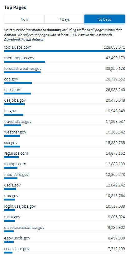Figure 2. Top pages, US federal government web domains, past thirty days (October 16–November 14, 2017), https://analytics.usa.gov/.